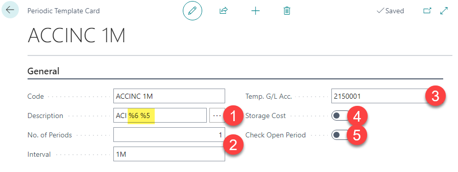 are set to be 1 and 1D /W/M when used in automatic posting, configured in 3PL Warehouse setup. For storage 1D is advised as for each day storage can be calculated en posted in correct storage period in case of 'split/broken week' Using more then 1 period, the template can be used to spread the line amount over multiple periods, using periodic starting date as calculation start date.